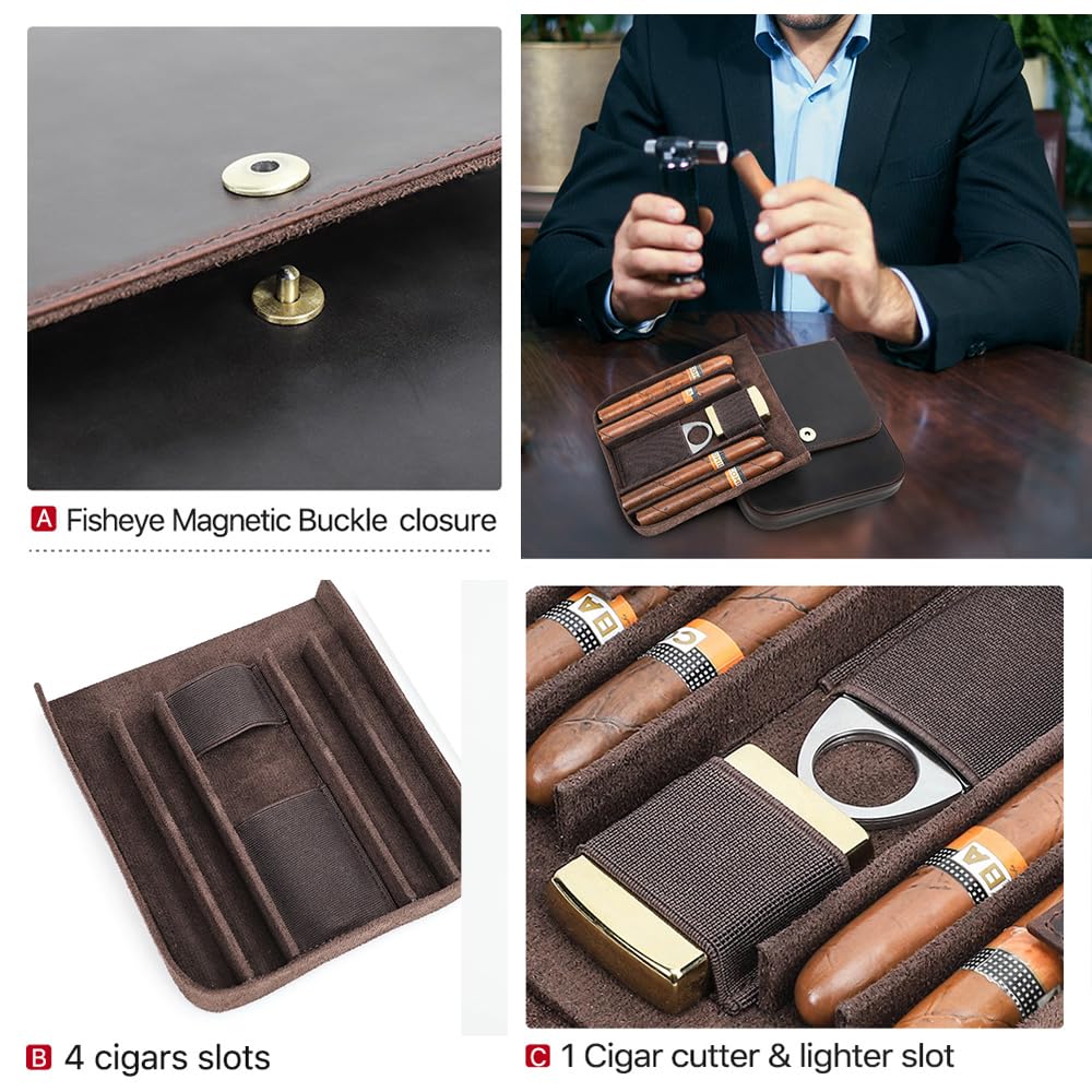 CONTACTS 4 Slot Cigar Case Travel Full Grain Leather Cigars Humidor Box Portable Cigar Accessories Organizer with Cigar Cutter Lighter Slot