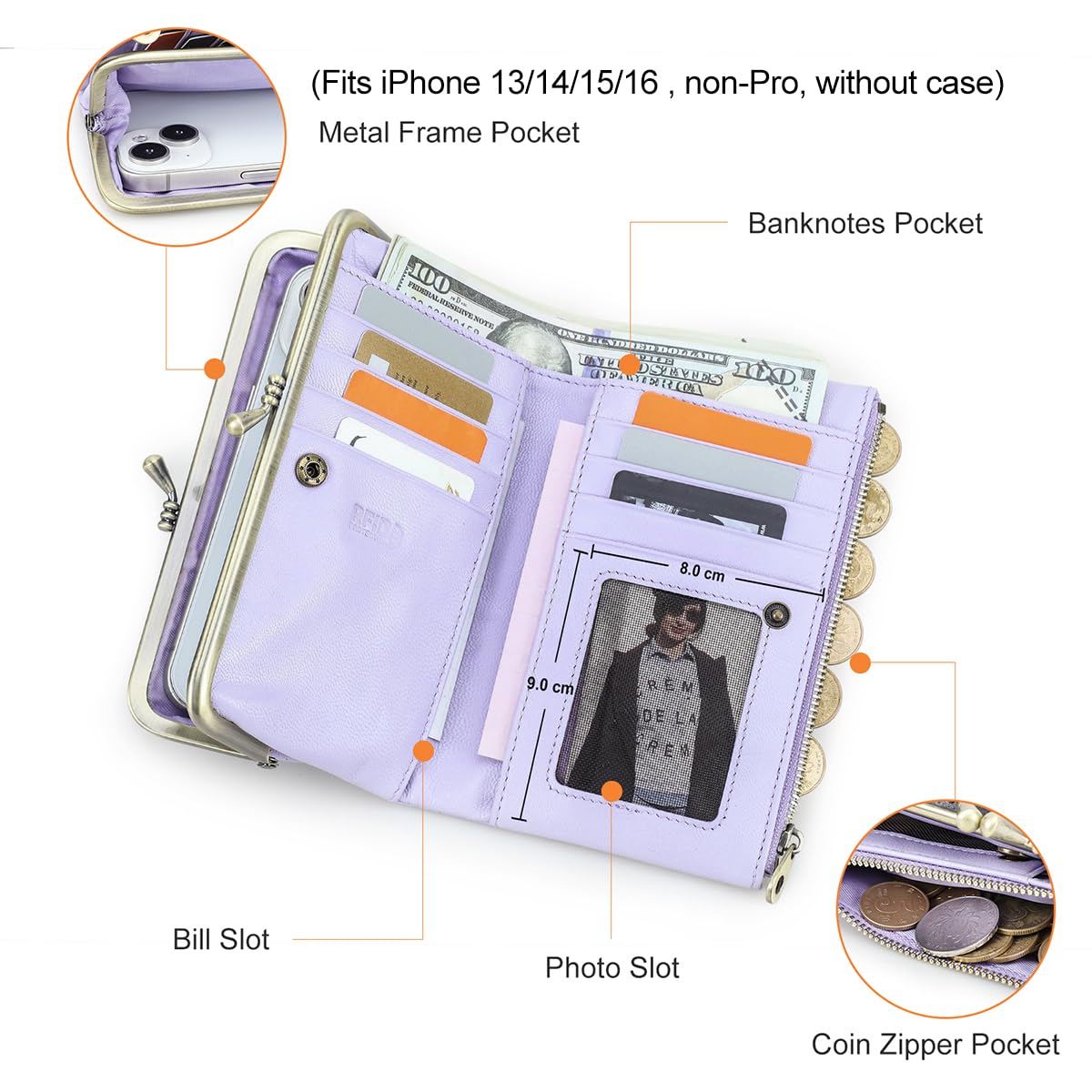 - Smart Internal: Features 7 card slots, 1 photo window, 1 bill compartments, 2 receipt slots, 1 zipper coin pouch and 1 pocket with kiss clasp. Purple wallets for women keep your daily essentials neatly organized and easy to reach