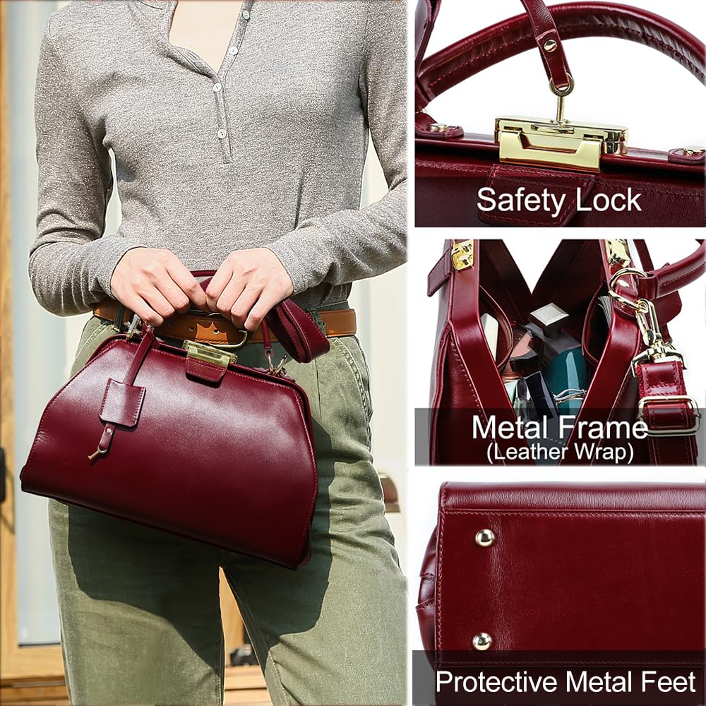 - Metal Frame Opening Meets Timeless Style: Luxury leather doctor style bag features a wide metal frame that stays open for effortless access. With its structured silhouette and vintage charm, it's designed for women who appreciate both elegance and everyday functionality