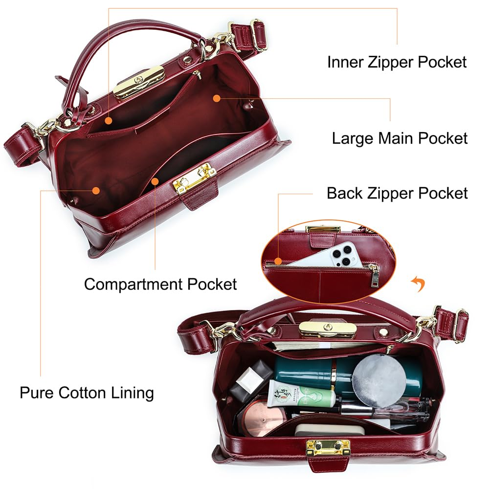 - Metal Frame Opening Meets Timeless Style: Luxury leather doctor style bag features a wide metal frame that stays open for effortless access. With its structured silhouette and vintage charm, it's designed for women who appreciate both elegance and everyday functionality