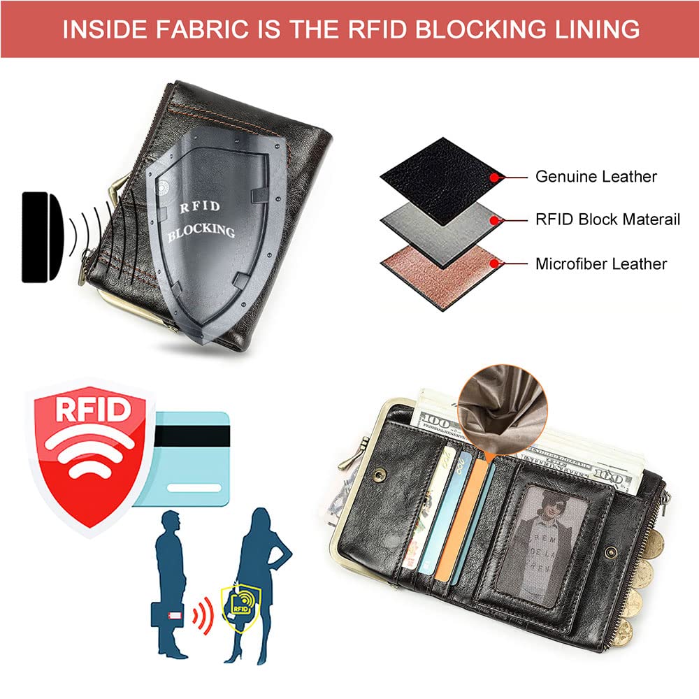 CONTACTS Full Grain Leather Kiss Lock Wallet for Women Small Zipper Coin Pocket Vintage Bifold Rfid Purse Card Holder with Photo Window