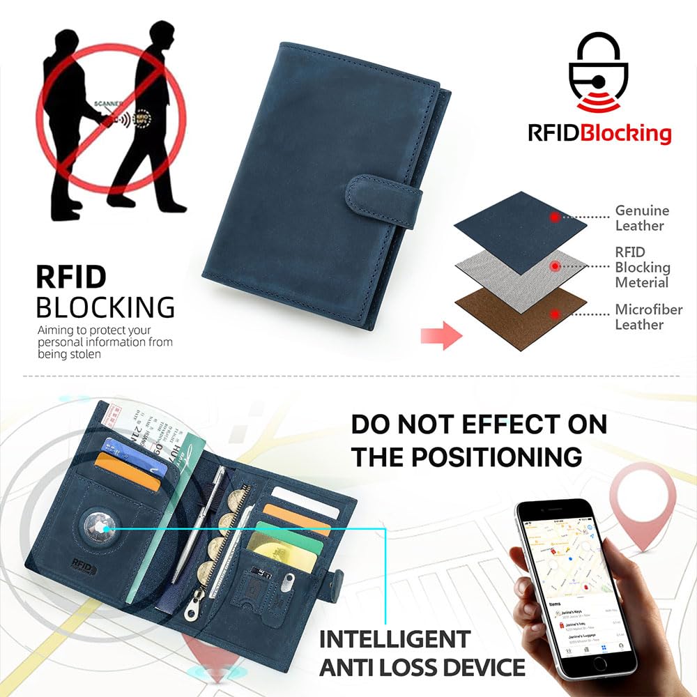 - Rfid Blocking & Compatible with Airtag: Blue passport holder for travel integrated RFID blocking layer helps protect your credit cards and passport from unauthorized scans. While a built-in slot for AirTag allows you to track your passport wallet anytime using your phone—peace of mind for international and domestic travel