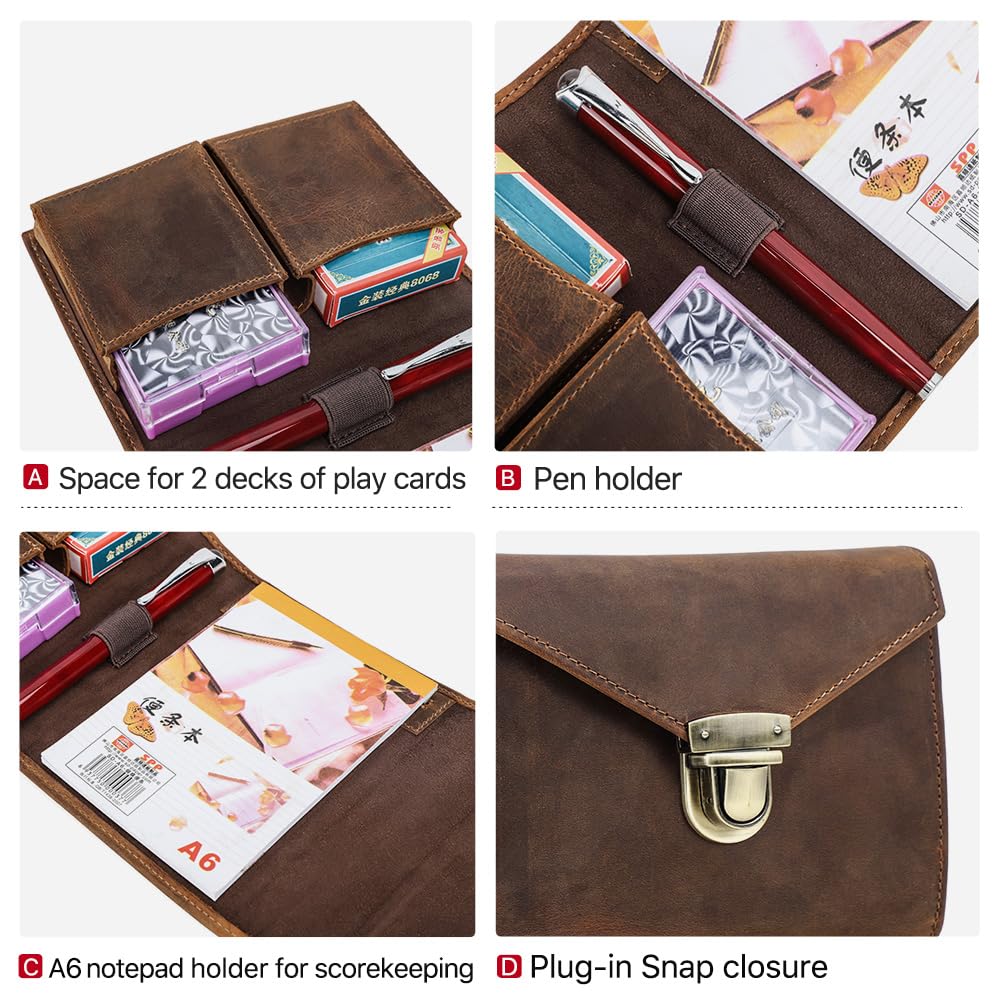 CONTACTS Full Grain Leather Playing Card Case for 2 Decks, Handmade Leather Playing Card Holder with A6 Notepad Pocket & Pen Loop Poker Card Travel Case for Adults