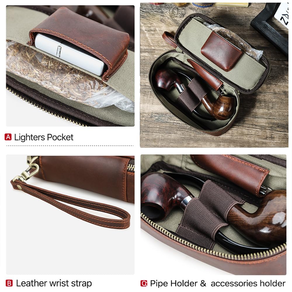 - Accessory Pockets: Genuine leather wood pipe storage box for men comes with 2 elastic band slots for 2 pcs pipe, 1 pocket for lighter, 1 side slot and 1 compartment for tobacco/pipe screen/pipe brush/pipe cleaner