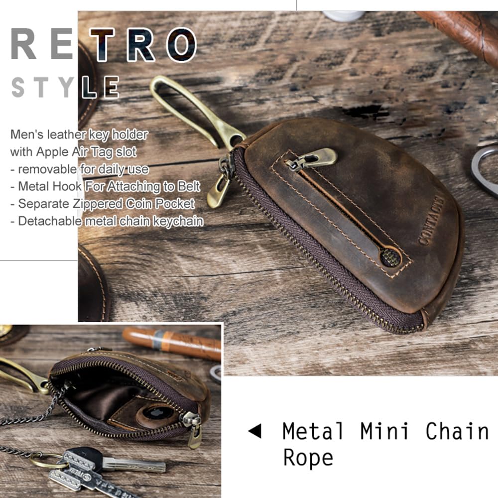 CONTACTS Key Holder Compatible with Airtag Full Grain Leather Small Key Case for Men Zipper Key Wallet with Hooks