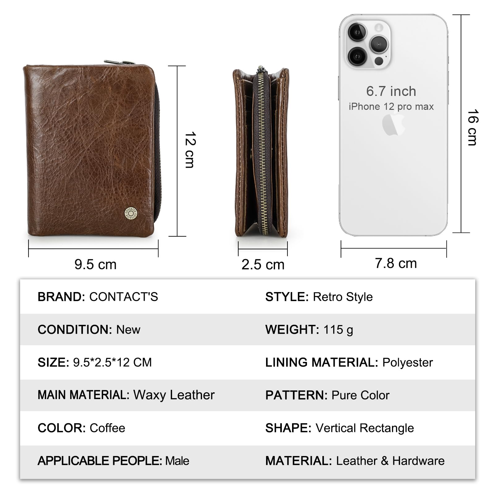 CONTACTS Mens Trifold Wallet Detachable Zip Coin Pocket RFID Blocking Leather Purse Zip Multi Credit Card Organizer with 7 Card Slots 1 Photo Window
