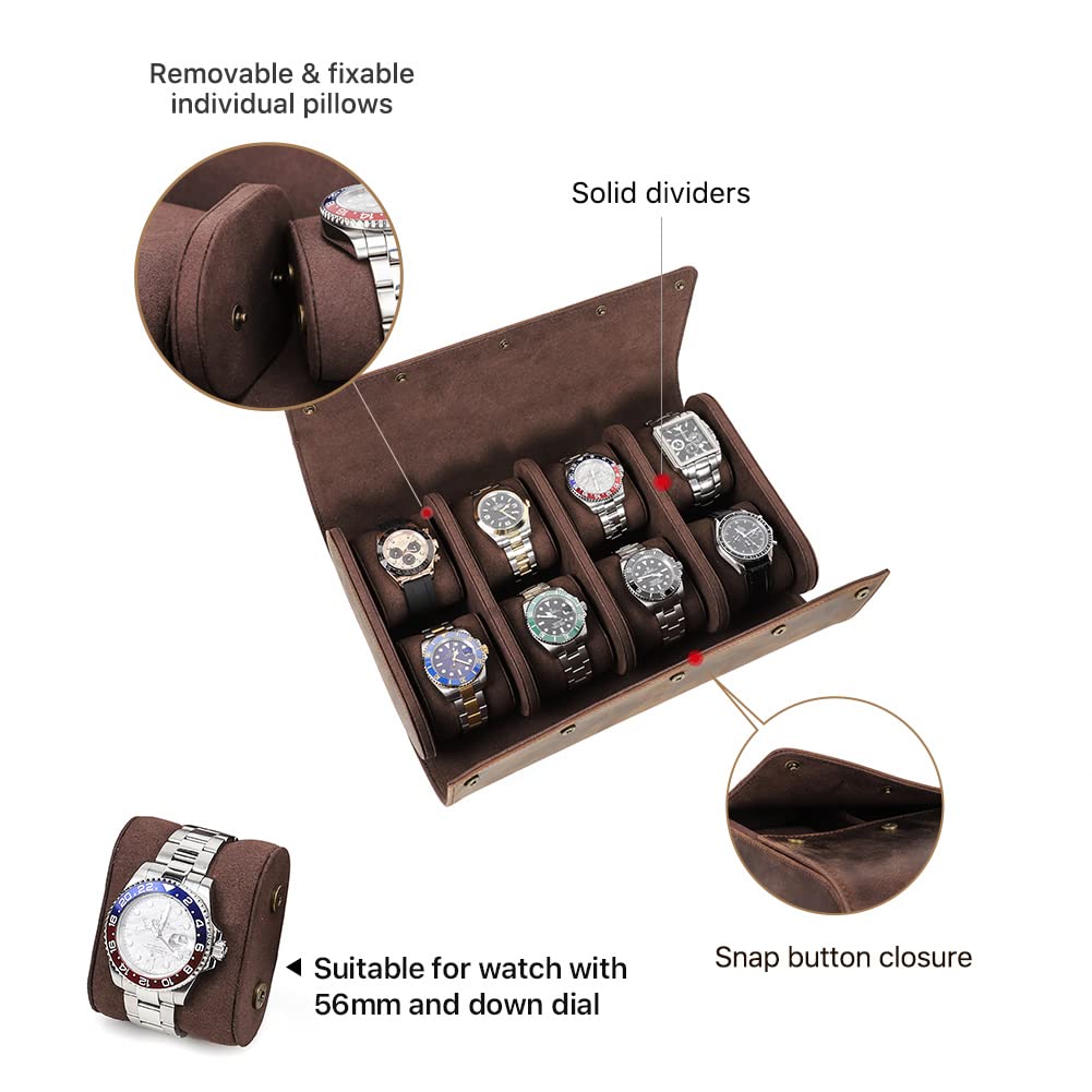 - 8 Watch Case - 8 removable pillows inside the leather travel brown watch roll , you can storage 8 watches. It's perfect for watch collectors.